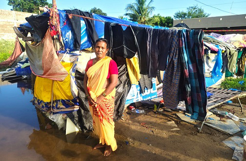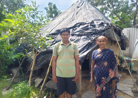 ABOVE: The cyclone hit Bharathi's house, here with her son, Arun (15). Bharathi has HIV and is not able to hold down a job. Her husband died of AIDS, and she is one of our widows. The tarp seems to be holding up, but the leaves of this thatched roof home are deteriorating. The ideal fix is to provide new asbestos sheets. If funds don't allow, then a new tarp will be useful for them in future days. |