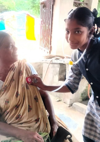 ABOVE: Venkata Lakshmi (right, 11 years old) is using her home-made stethoscope to check Sister Lakshmi's heart rate. Of course it's a toy, but impressive that she made this herself. We're so thankful for this girl, who lost both her parents when she was very young, and has spent most of her life in hostels and with neighbors. Now she's happy in our girls home with 4 other girls. They're living in a rented home, our Sister Mary watching over them. |